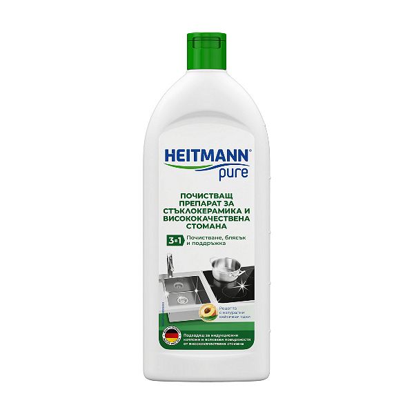 3 в 1: Интензивно почистване, нежна грижа и сияен блясък – с почистващия препарат за стъклокерамика и неръждаема стомана HEITMANN pure можете лесно да премахнете замърсявания, петна, остатъци от храна, преливащи се отлагания и котлен камък от котлони и други предмети.