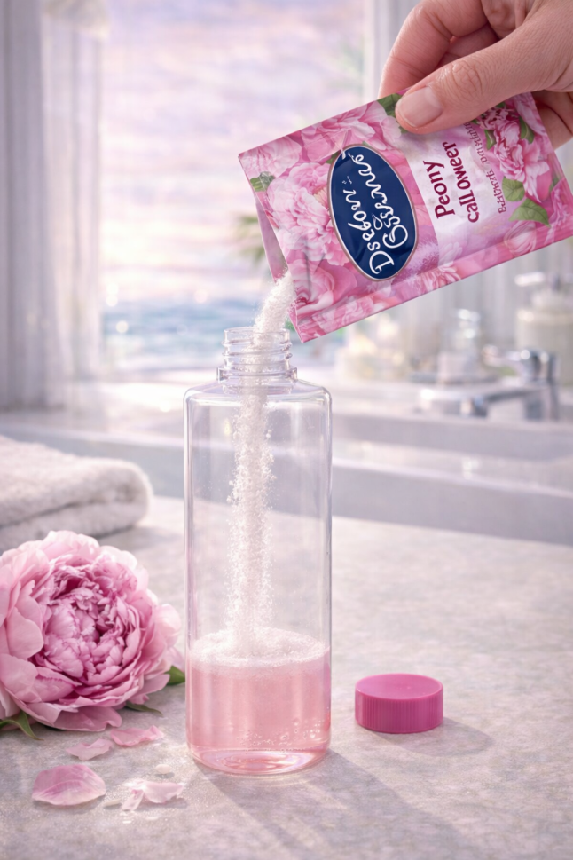Насладете се на иновативна и устойчива грижа с веган душ гел на прах Dresdner Essenz Soft Peony. С чувствен флорален аромат на божур, този душ гел подхранва кожата, като я оставя гладка, хидратирана и ухаеща на свежест. Подходящ е за ежедневна употреба и е специално създаден за суха кожа.