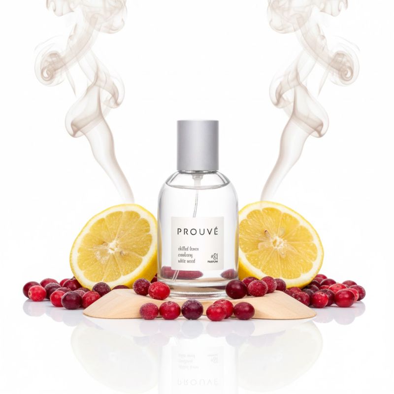 Ухае на охладен лимон, червена боровинка и бяло дърво.