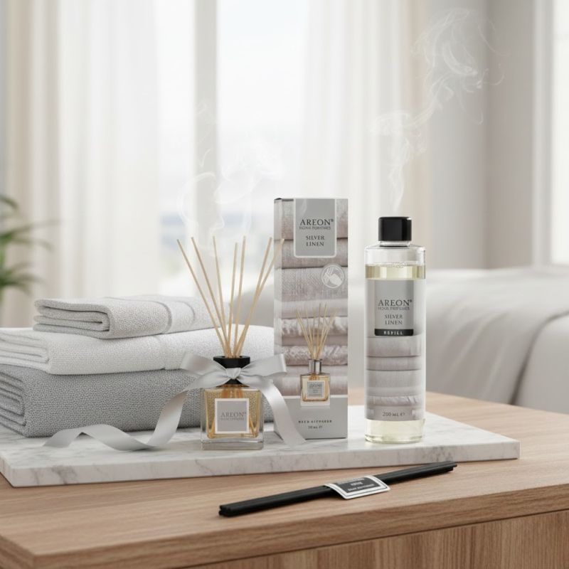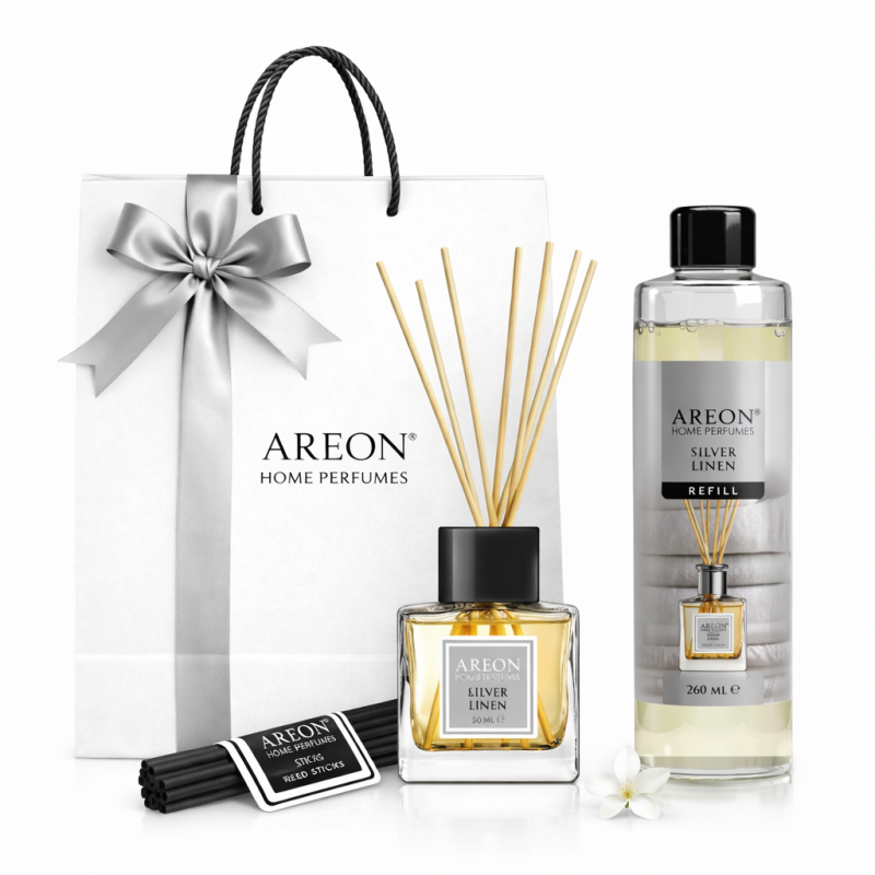 Ароматният сет „Сребърен лен“ съчетава елегантен, свеж и чист аромат, който създава усещане за уют и хармония във всеки дом. Подходящ е за всекидневна, спалня, офис или баня.