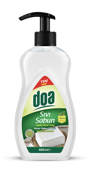 DOA Temizlik Течен сапун DOA Бял сапун – 400мл е нежен и ефективен продукт за ежедневна хигиена на ръцете, създаден да почиства кожата, без да я изсушава. Формулата, обогатена с маслиново масло, подхранва и омекотява кожата, като я оставя чиста, свежа и приятна на допир.