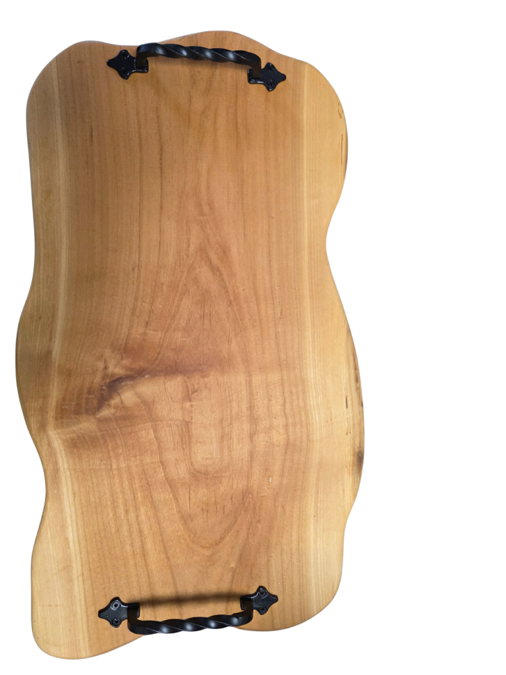 Елегантно и естествено плато, изработено от масивна дива череша. Отличава се с красива, топла дървесна шарка и плавно оформени ръбове, които подчертават естествения характер на дървото. Оборудвано е с удобни метални дръжки с декоративни порцеланови елементи, които придават стил и стабилност при пренасяне.