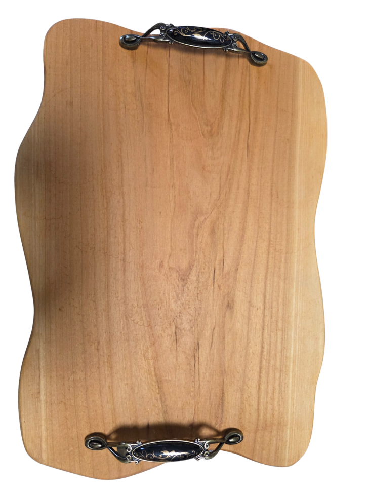Елегантно и естествено плато, изработено от масивна дива череша. Отличава се с красива, топла дървесна шарка и плавно оформени ръбове, които подчертават естествения характер на дървото. Оборудвано е с удобни метални дръжки с декоративни порцеланови елементи, които придават стил и стабилност при пренасяне.