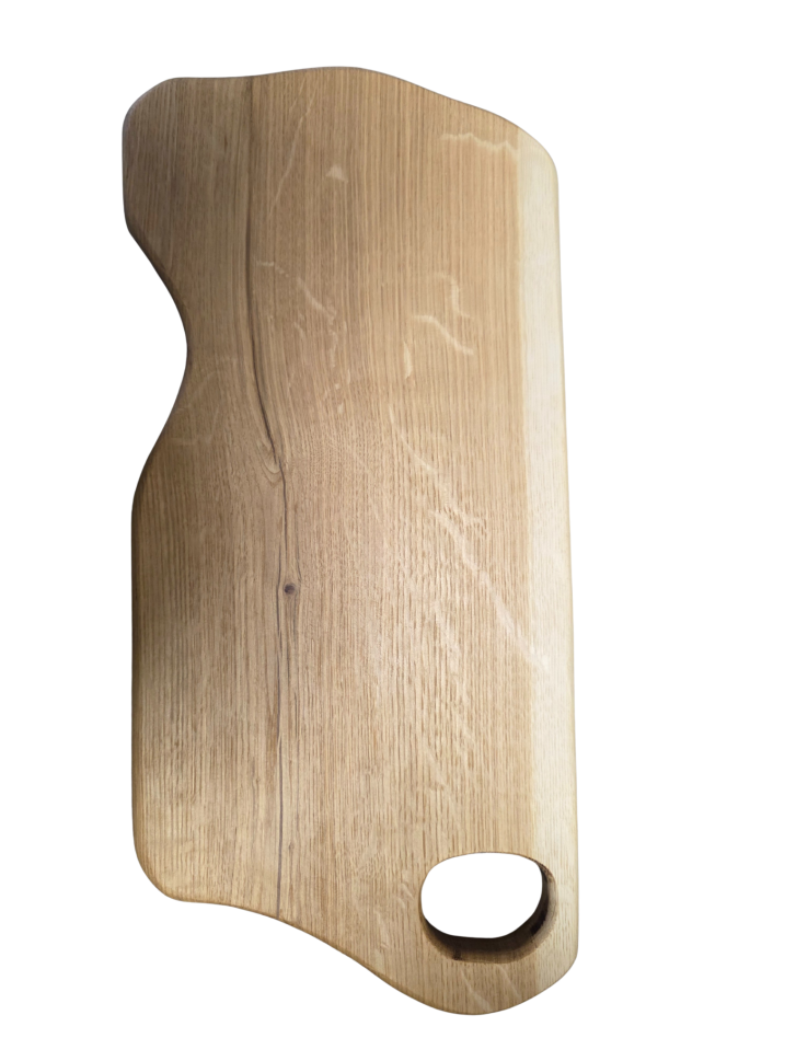 Практична и елегантна дъска, изработена от висококачествен масивен дъб. Отличава се с изчистен дизайн и естествена дървесна шарка, която придава топлина и автентичен характер на всяка кухня. Удобната дръжка с отвор позволява лесно пренасяне и окачване.