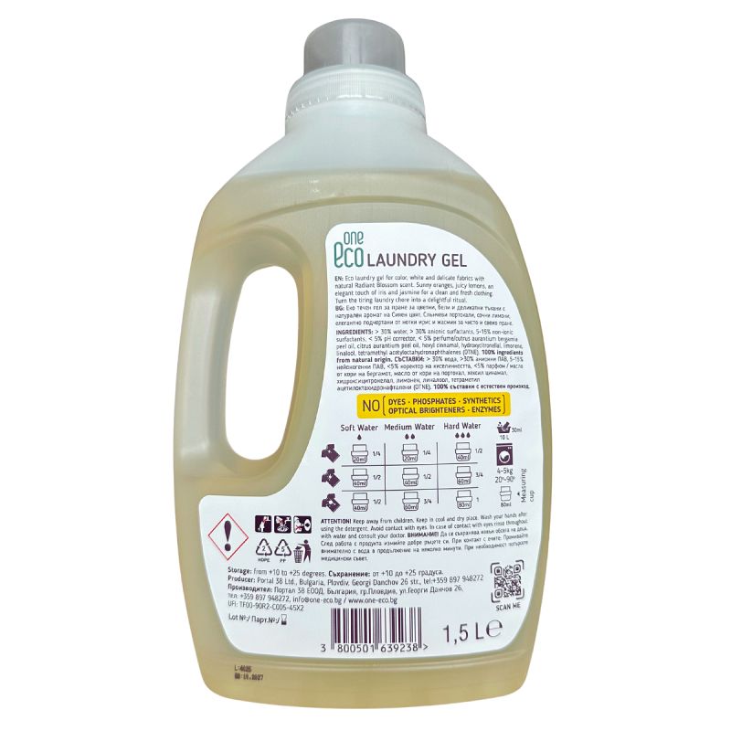 Еко течният гел за пране OneEco е създаден за хора, които търсят ефективно, щадящо и природосъобразно решение за пране. Концентрираната му формула съдържа 100% съставки с естествен произход и почиства дрехите в дълбочина, като същевременно се грижи за тъканите и кожата.