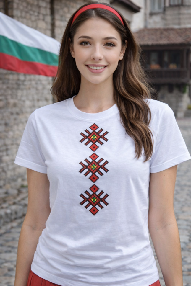 Уникален дизайн с народни мотиви: Автентичните шевици, принтирани чрез трансферен печат, добавят уникален и стилен акцент към тениската. Тези мотиви не само подчертават вашата индивидуалност, но и отдават почит на българската култура и традиции.