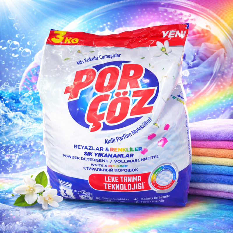 Por Çöz Универсален прах за пране (3 кг) е ефективно и икономично решение за ежедневно пране, създадено да осигури дълбоко почистване и свежест на всички видове тъкани. Подходящ както за бяло, така и за цветно пране, този универсален препарат премахва упорити замърсявания и запазва яркостта на цветовете.